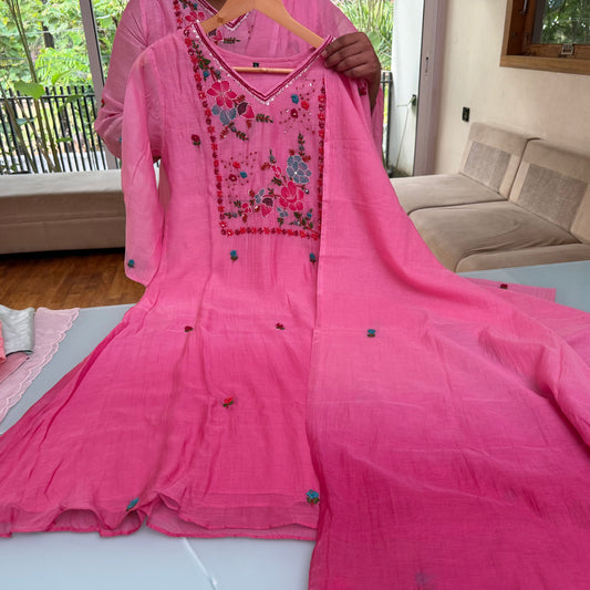 Premium Surat Chanderi Handwork Neck 3 Piece Set – Elegant Pink